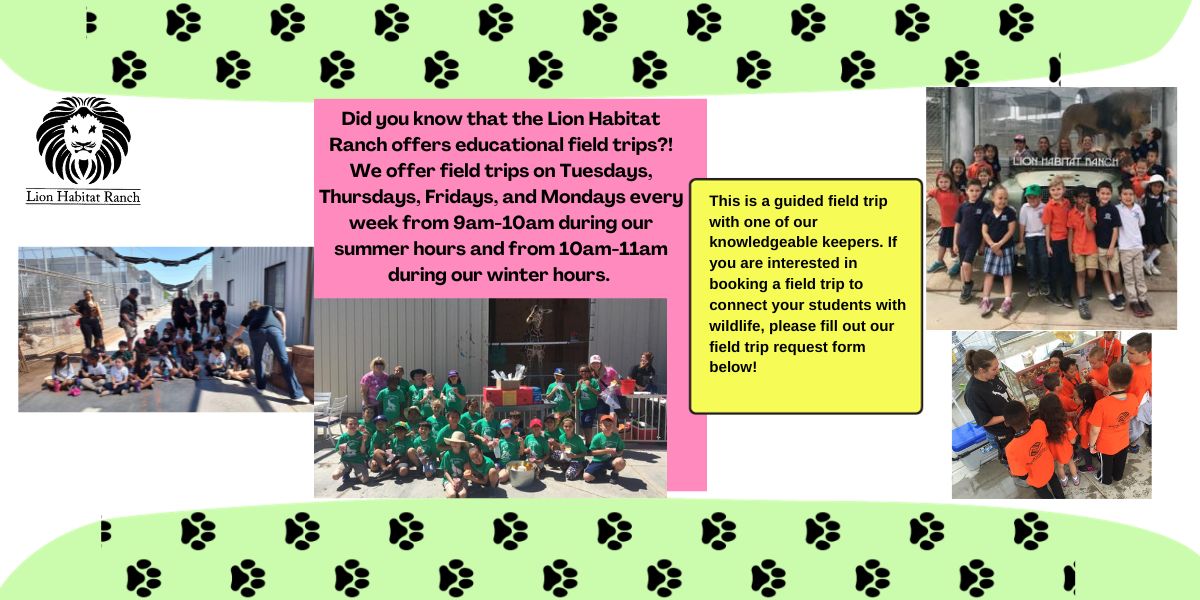 Connect your students with wildlife in a meaningful, memorable way at the Lion Habitat Ranch. Fill out your Field Trip Request Form today!