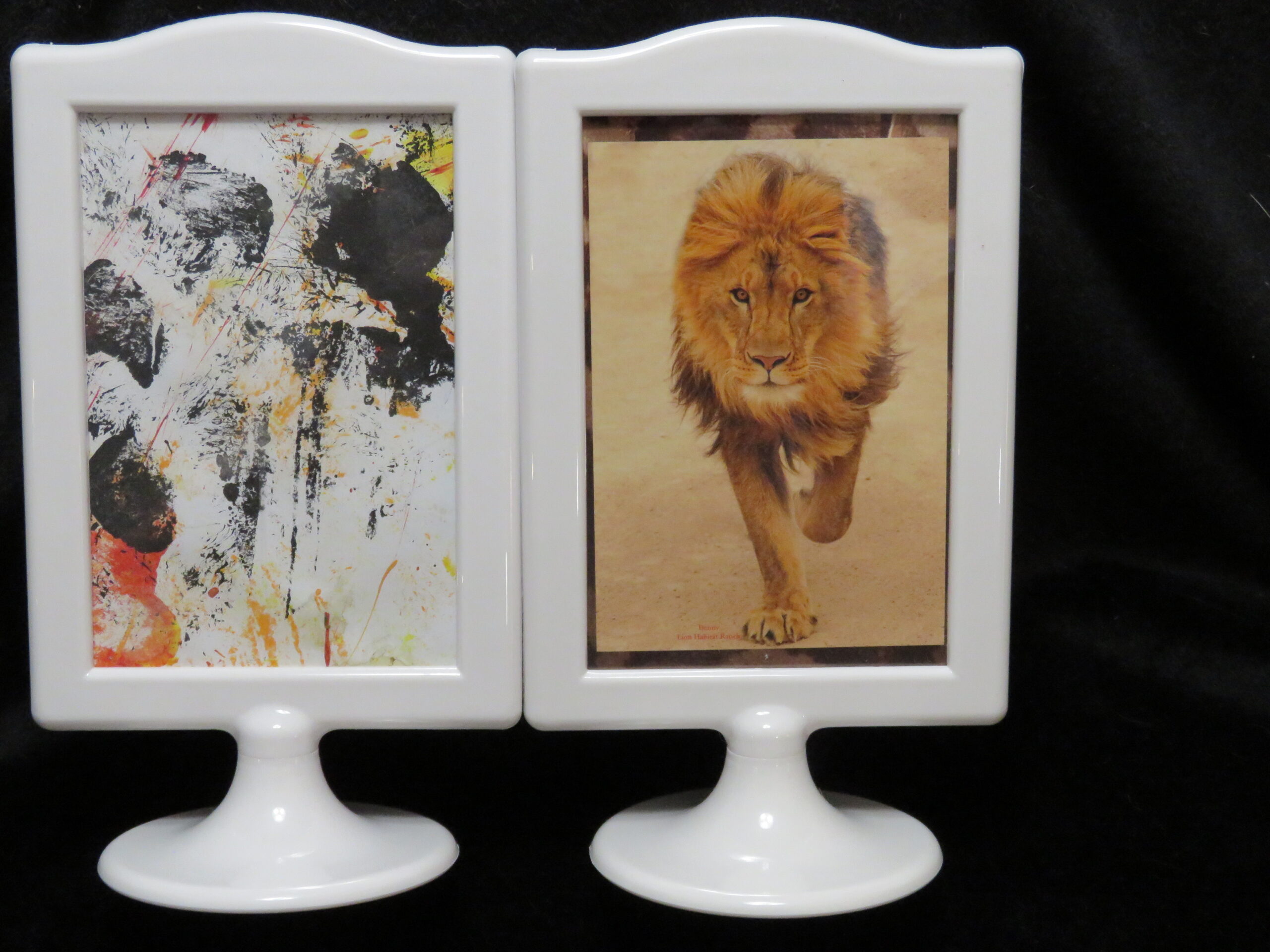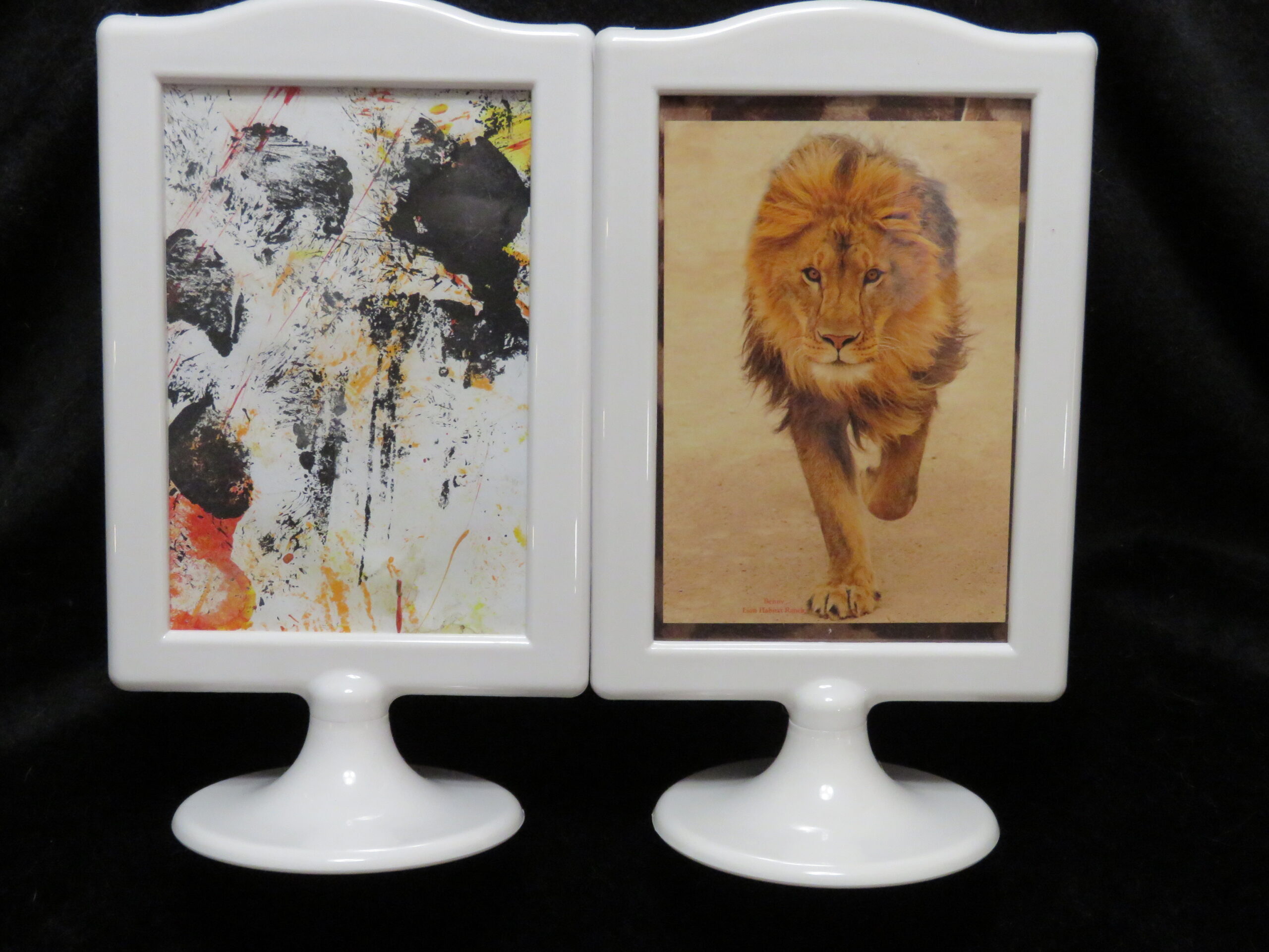 Enhance your collection with this 3.75″x4″ white frame, featuring a unique painting by Benny the lion and his photo. Created during enriching training sessions, Benny’s paw-crafted art captures his creativity and playful spirit. A must-have for any animal lover!