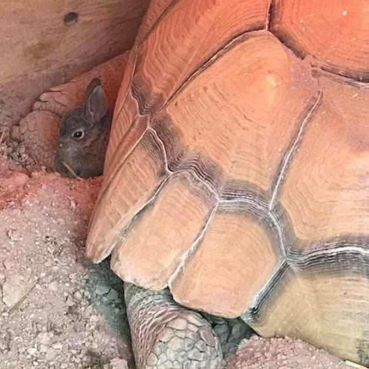 Bulldog, our biggest tortoise at 130 pounds, got himself a very little friend! 🐰❤️🐢