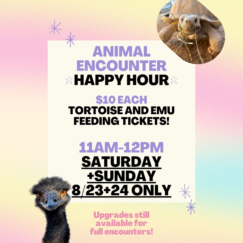 ❗Join us today and tomorrow, August 23rd and 24th to enjoy our animal encounter happy hour! From 11am-12pm ONLY, we`re offering tortoise and emu feeding tickets for only $10! Arrive before 11am to get checked in and get in line! Emu feedings will run from 11am-11:30am and tortoise feedings from 11:30am-12pm! Tickets can be purchased in cash at the animal enclosures or using card in our ticket booth and gift shop. Upgraded tortoise and emu encounters are still available as well!