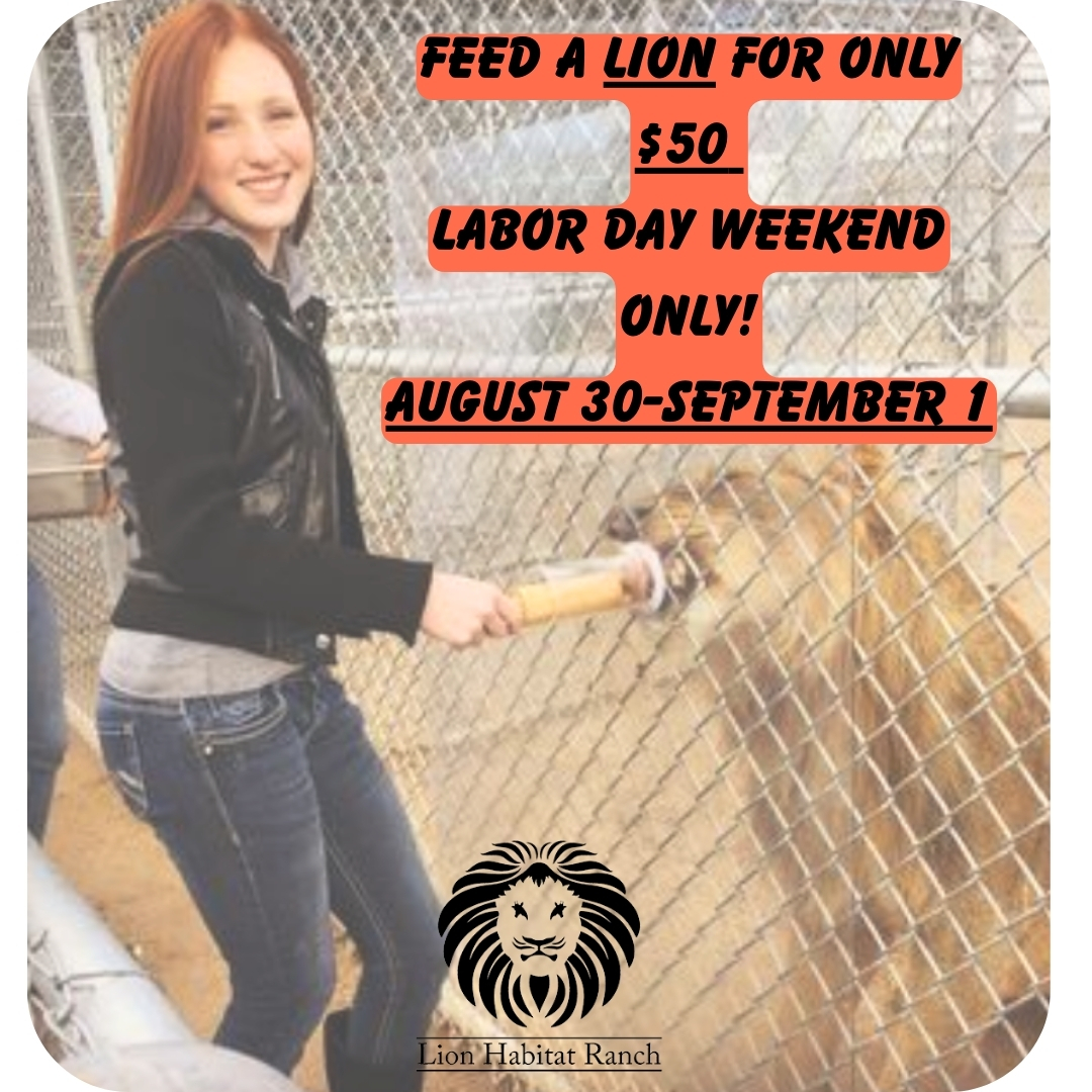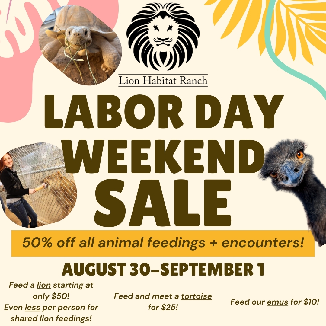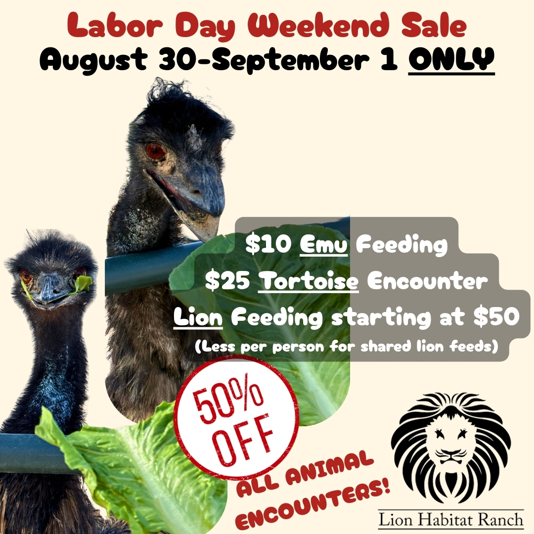 💲The Lion Habitat Ranch 50% off all animal encounters sale starts today! From today, August 30-September 1, enjoy emu feedings for only $10, tortoise encounters for $25, and feed a lion starting at only $50 (even less per person when you share a lion feed!)